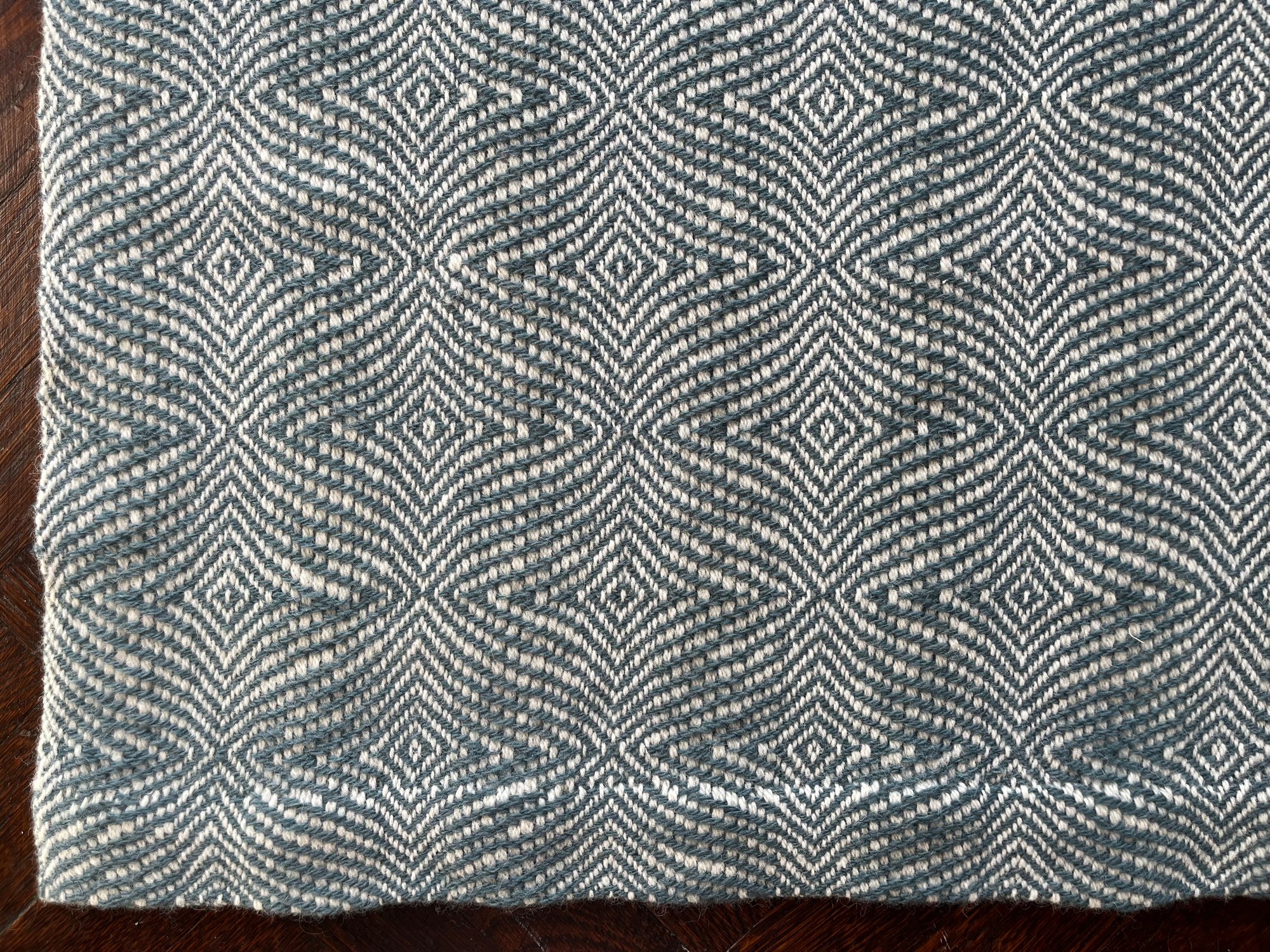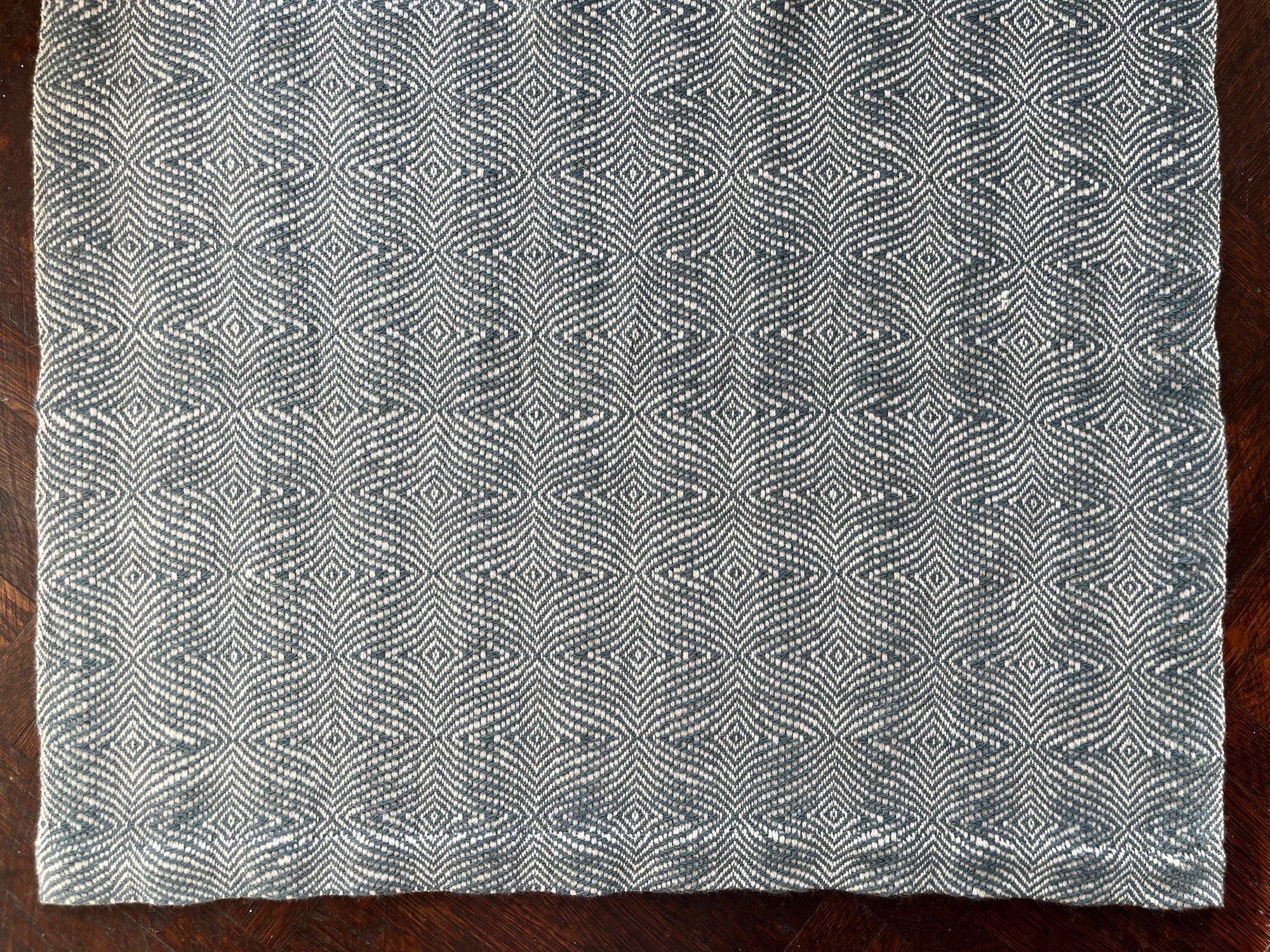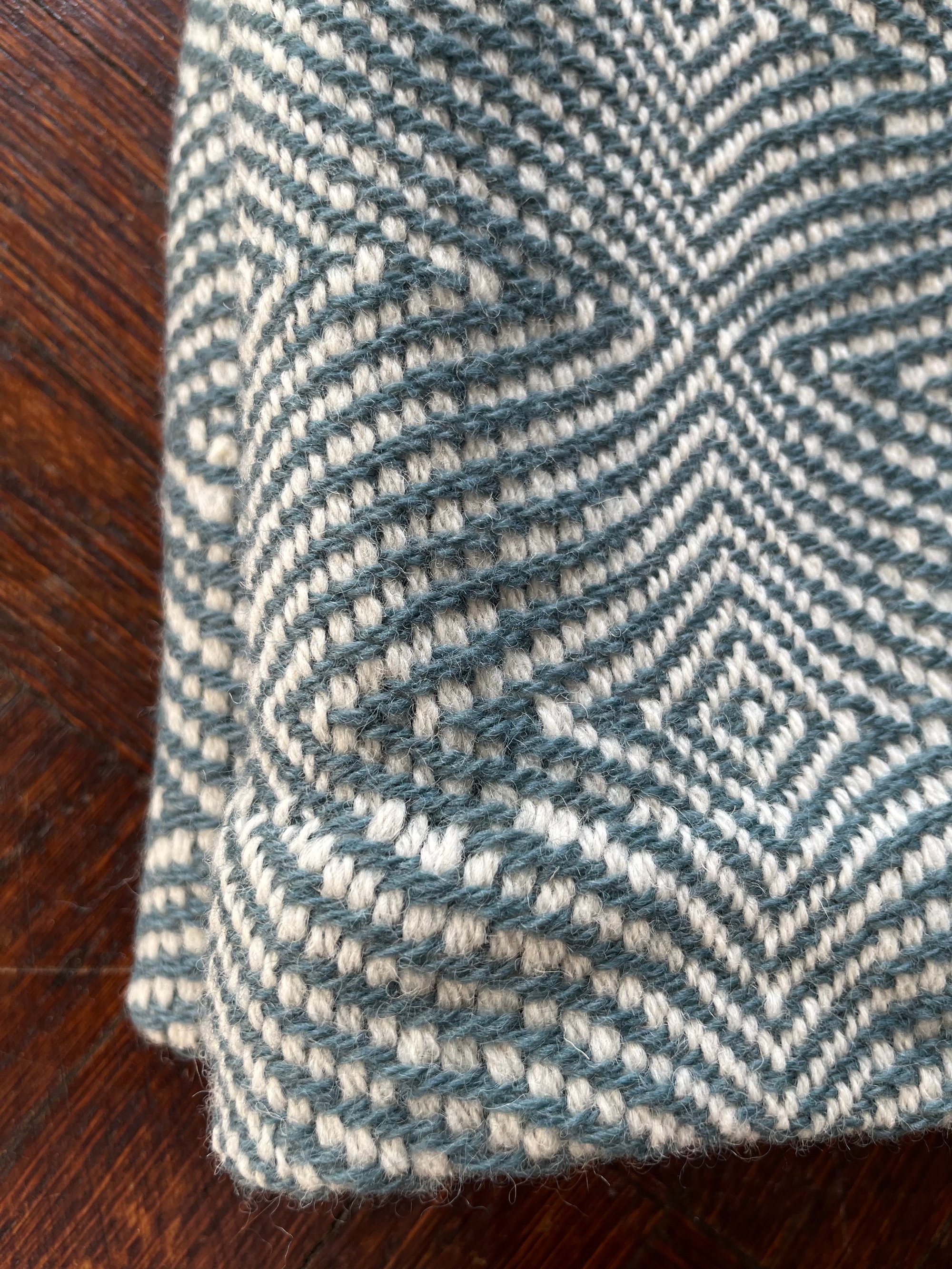 This blanket was handwoven on a nineteenth century barn loom. I measured the warp, threaded the heddles, sleyed the reed, beamed on, wove the towels, and finally cut each one and sewed the hems by hand.